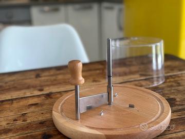 Girolla con tagliere in legno e lama in acciaio inossidabile e copri formaggio in plexiglass.