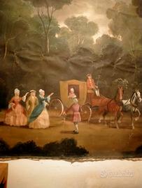 Vendesi importante dipinto a olio su tela di grandi dimensioni (140 x 190 cm), raffigurante una suggestiva scena galante del Settecento con carrozza e figure nobiliari. L'opera è firmata "Carlini" in basso a destra, riferibile alla mano del maestro Giulio Carlini.