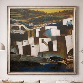 Paesaggio siciliano tipico della produzione di Giuseppe Migneco: case geometriche, colline mediterranee e colori intensi di grande forza espressiva.