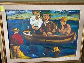 Giuseppe Serafini - olio su cartone. Misure 50x70 cm. Cornice in legno. Soggetto pescatori in barca.