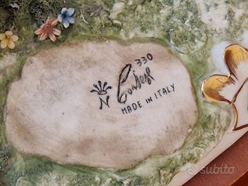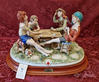 “Gli imbroglioni” magnifica opera in di Capodimonte da collezione in edizione limitata, realizzata e dipinta a mano dall'artista italiano Germano Cortese. è una scena di porcellana di grandi dimensioni, finemente dettagliata e dai colori vivaci, che raffigura tre ragazzi che giocano a carte mentre un quarto ragazzo li guarda. Sotto il tavolo, il ragazzo a destra si è tolto una scarpa e con le dita dei piedi sta passando un sette di quadri al ragazzo a sinistra, che lo sta raggiungendo, mentre un bassotto guarda accanto a una pila di libri di scuola. La porcellana poggia su una base di legno con una targhetta in ottone con la scritta Cortese. Creatore: Germano Cortese Dimensioni: Altezza: 29,21 cm Larghezza: 50,8 cm Profondità: 38,1 cm Materiali e tecniche: Porcellana Capodimnte , Dipinto a manio Periodo: XX secolo Data di produzione: circa anni '80/90 Condizioni: Nuovo (mai esposto ) giacenza magazzino Certificato di garanzia