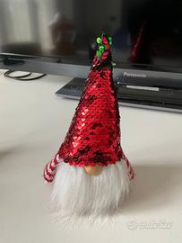 Gnomo Grande: Cappello a cono in tessuto ricoperto di paillettes reversibili, che cambiano da verde brillante a rosso scarlatto. Ha una lunga barba bianca e folta.