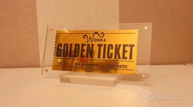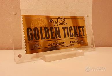 Iconico Golden ticket Willy Wonka in teca espositiva trasparente con piedistallo. Riproduzione totalmente fedele all'originale per stampe fronte e retro e per dimensioni. Pezzo unico nel suo genere per collezionisti. Condizioni perfette.