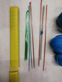 Vendo in blocco 2 cuscini fatti a mano, 4 gomitoli di lana e ferri da maglia.