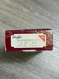 Scatola vintage contenente 8 gomme/matite Läufer con punta in metallo per una tenuta salda delle fibre di vetro,utilizzabile per cancellare su carta trasparente o pergamena,per lucidare,pulire,levigare,rimuovere la ruggine,nuove e mai usate(sono 8 e non 10),da collezione privata.