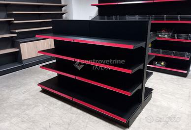 N.3 Gondola linea Ipermarket 35 completa di schienali, n. 2 piani base unici forati da 100 X 40, N. 6 piani unici forati completi da 100 X 40 regolabili in altezza. Coprischienale superiore e carter inferiore. Scaffalatura metallica di colore Nero SDE, Portata piano base: KG. 230 distribuiti uniformemente, portata piano sospeso: KG. 170 distribuiti uniformemente. (Escluso portaprezzi) DIMENSIONI: 100 X 91 X 143,5 H