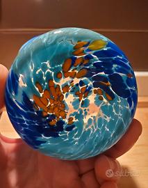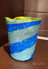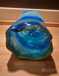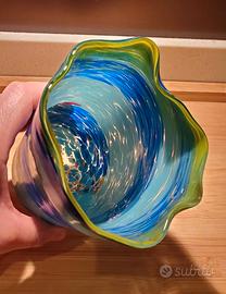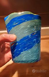 Goto veneziano artigianale in vetro soffiato, dalla caratteristica forma mossa e irregolare (13hx10l ca.), nelle tonalità del blu con bordatura a riflessi gialli.