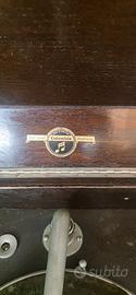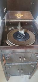grammofono perfettamente funzionante a corda della viva-tonal columbia granofola fatto in Inghilterra .Grammofono verticale in legno e suddiviso in due parti la.parte superiore e i coperchio per la copertura del disco,e la parte sotto e divisa in quattro sportelli che nascondono la tromba interna,nella parte destra c'è una manovella che caricandola fa girare il.disco caricato a corda perfettamente funzionante