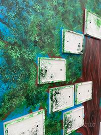 Vendo splendida struttura per albero genealogico realizzata e dipinta interamente a mano su pannello di compensato da 1 cm. Dimensioni: 120 cm (larghezza) x 170 cm (altezza). Dettagli: L'opera presenta un imponente tronco centrale con chioma rigogliosa su sfondo azzurro. Sono presenti 13 cornici in rilievo pronte per ospitare foto o nomi dei membri della famiglia. Stato: Ottime condizioni, ideale per ampie zone giorno, ingressi o come regalo unico per ricorrenze familiari e anniversari.