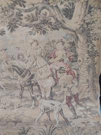 Arazzo con scena di caccia realizzato da Cesare Auguste Detti alla fine dell'800, dimensioni 194x170 cm. completo di asta di supporto superiore in legno (in caso di spedizione l'asta verrà rimossa e l'arazzo ripiegato). Ottime condizioni generali, l'esposizione alla luce nel tempo ne ha determinato una generale decolorazione.