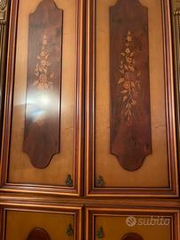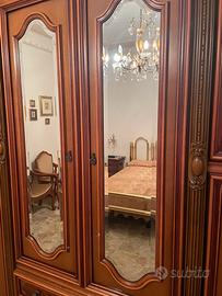 Vendo imponente armadio in stile classico, realizzato in legno con elegante finitura color noce e raffinati intarsi floreali. L’armadio è composto da 6 ante, di cui 2 centrali con specchio, ed è dotato di cassetti inferiori comodi e capienti. Le ante presentano pannellature lavorate e decorazioni intarsiate, mentre i dettagli scolpiti sui montanti laterali donano un aspetto importante e ricercato. ✔ Dimensioni importanti: circa 300 x 300 cm✔ Struttura solida e robusta✔ Ampio spazio interno per abiti e biancheria✔ Ideale per arredamenti classici o camere eleganti L’armadio è in buone condizioni generali, completo e funzionante. Venduto anche in abbinamento a comodini da letto e comò con specchiera (vedi altri annunci) 📦 Smontaggio e trasporto a carico dell’acquirente.📍 Ritiro a mano a Siracusa centro