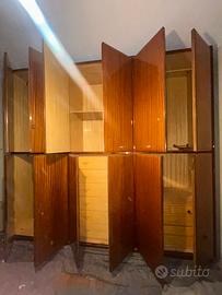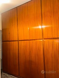 Vendo armadio vintage anni ’60 in finitura mogano, composto da 12 ante con cassettiera nella parte inferiore centrale e laterale destra.