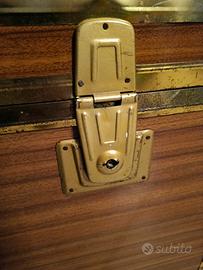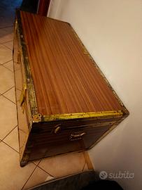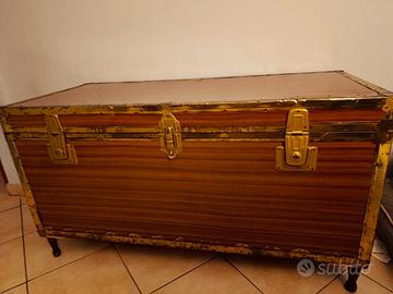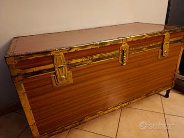 Si vende, previo ritiro a domicilio, grande baule vintage, con maniglie laterali e piedini di legno. È completamente rivestito internamente. I bordi di metallo sono un po' arrugginiti e le chiusure sono rotte, ma è molto capiente e utilizzabile per conservare biancheria o oggetti. Misure: p. 54,5 l. 119 h. 65
