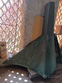 Grande cappa artigianale in rame per barbecue o camino, realizzata negli anni 70 e mai utilizzata ma sempre mantenuta al coperto. Di pregevole e originale disegno va addossata al muro all'interno o all'esterno per realizzare una struttura di grande effetto ed importante, adatta a privati o a ristoranti /agriturismo. La parete posteriore è in lamiera di ferro, il resto della struttura è interamente in rame, irrobustita e caratterizzata sugli spigoli da un cordoncino in rame sbalzato . La superficie è integra e presenta la naturale ossidazione del rame.