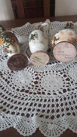 Bellissimo centro tavola tutto realizzato a tombolo ed uncinetto diametro cm 67 lavorato da anziane signore nell'entro terra delle Marche nelle lunghe serate invernali Prezzo solo20 euro. Dispongo di molti alti centrini di piccole dimensioni in vendita a 4 euro cadauno. Per i tre vasi potete contattarmi al 3498094903 Giuseppe