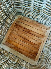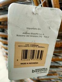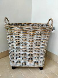 Grande e molto robusto cesto della marca Bizzotto, intrecciato con vimini naturale con finitura sbiancata che lascia trasparire la tinta naturale. Con manici e fondo in legno, dotato di ruote girevoli.
