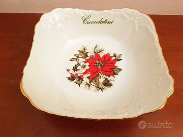 Grande ed elegante ciotola Limoges porta cioccolatini, di forma quadrata con bordi stondati a rilievo e finiture dorate.