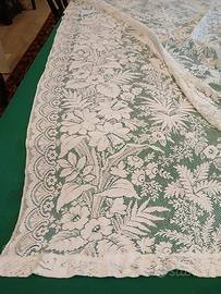 Pregiato pizzo per tenda o copritavolo in cotone bianco in ottime condizioni con elaborata decorazione floreale.