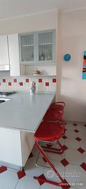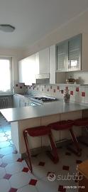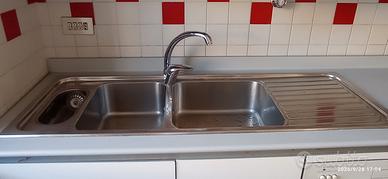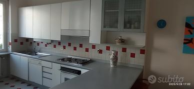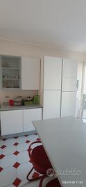 Cucina con penisola a L, linea moderna, colore bianco e grigio, apertura a gola, completa di tavolo allungabile e elettrodomestici : doppio lavello, gas a sei fuochi, forno AEG, frigo e freezer, lavastoviglie Rex, 3 sgabelli. Dimensioni 4.10 m cm x 1,75 L . Separato ulteriori colonne da 2.45 m con frigo nuovo. In buone condizioni. Smontaggio e spedizione a parte. ottimo affare!