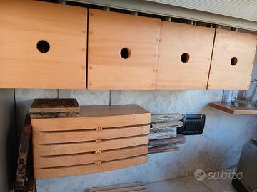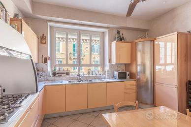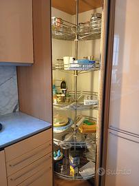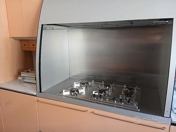 Cucina marca Valcucine laccata lucida color salmone, piani in marmo di Carrara, dispensa angolare con 5 ripiani rotanti, tavolo quadrato di 1 metro per lato con 4 sedie in legno naturale, inclusi forno statico Alpes, piano cottura a 6 fuochi, cappa, lavastoviglie Ikea. Larghezza lato cottura 3,60 m, lato lavello 4,20 m, lato corto 1,50