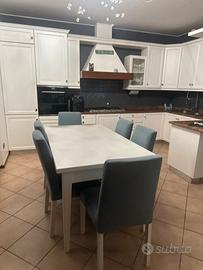 Vendo Cucina in noce massiccio laccata bianco… come da foto …. No forno…. Consegna da aprile …. Top in marmo granito …. Comprensiva di frigo no frost congelatore …. Piano 5 fuochi …. Scolapiatti in acciaio … mensolone con faretti . Comprensiva di tavolo e 6 poltrone come da foto… anche il tavolo il legno massiccio e’ stato laccato bianco…. Usata ma molto ben tenuta … gli interni sono in legno … vendo per trasferimento