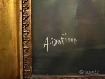 In vendita un affascinante e imponente dipinto a olio su tela degli anni '70, opera dell'artista A. Da Fiore. Il quadro raffigura un suggestivo paesaggio rurale classico con un antico casale, un ponte in pietra su un corso d'acqua e figure umane, il tutto incorniciato da una ricca e scenografica cornice dorata. Un pezzo d'arte di grande impatto visivo e di sicura provenienza. Dettagli dell'Opera Artista: Firmato in basso a sinistra "A. Da Fiore" (firma ben visibile anche nel dettaglio fotografico). Titolo dell'Opera: "Paesaggio" (come riportato sul certificato di garanzia originale sul retro). Tecnica: Dipinto originale ad olio su tela. Soggetto: Un paesaggio bucolico e dettagliato con architetture antiche, un fiume che scorre sotto un ponte ad arco, alberi maestosi, montagne sullo sfondo e piccole figure animate che aggiungono vita alla scena. Lo stile evoca la pittura di paesaggio classica italiana. Dimensioni: Formato Tela (come da certificato): 60x120 cm (un formato panoramico molto scenografico). Cornice: Splendida cornice d'epoca in legno dorato, riccamente lavorata con decorazioni floreali e volute in rilievo. È un elemento di pregio che valorizza notevolmente il dipinto. Condizioni e Provenienza Condizioni: Il dipinto su tela è in buone condizioni generali, con colori ancora vividi e brillanti. La cornice dorata presenta lievi e normali segni del tempo coerenti con l'età, che non ne pregiudicano l'estetica ma anzi ne attestano l'autenticità. Certificazione: Sul retro del quadro è presente il Certificato di Garanzia originale d'epoca, parzialmente usurato ma leggibile, che conferma il titolo, il formato, l'autore "A. Da Fiore" e la data di acquisto scritta a mano: ACQUISTATO DA Omissis 1974. Questo documento conferisce ulteriore valore e tracciabile.
