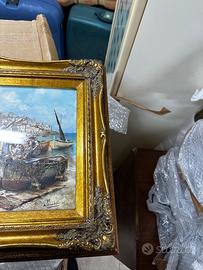 Vendo splendido dipinto a olio su tela di ampie dimensioni, raffigurante una suggestiva scena di vita quotidiana dei pescatori in una località costiera italiana. L’opera si distingue per l’ottima resa dei dettagli, la vivacità dei colori e la maestria nel catturare la luce del borgo marinaro. Dettagli dell’opera: Soggetto: Scena di genere con pescatori, barche e borgo marinaro sullo sfondo. Tecnica: Olio su tela. Cornice: Importante cornice dorata riccamente lavorata con fregi ornamentali agli angoli, in perfetto stile classico. Firma: Firmato dall'autore in basso a destra. Stato di conservazione: Eccellente, sia per la tela che per la cornice; colori vividi e struttura solida.