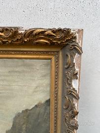 Grande dipinto olio su tela, veduta con montagne, cornice dorata legno e gesso. Da restaurare. H 104 x L 146 cm. Non spedisco.
