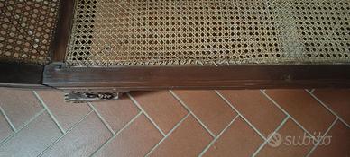 Grande divano in legno e paglia di Vienna, con varie decorazioni. Misure: larghezza 188 cm, profondità 59 cm, altezza 70 (laterale) e 86 (fregio al centro della testata). In ottime condizioni tranne un rammendo da fare su circa 30 cm di bordo.