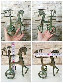 Figura Statua in vero bronzo che rappresenta un carro greco antico con la dea Atena (Minerva) che tiene in mano una civetta, simbolo di saggezza.
