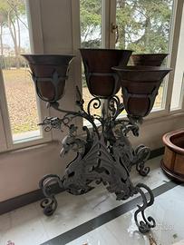 Grande fioriera decorativa in ferro battuto lavorato a mano con quattro coppe in rame.