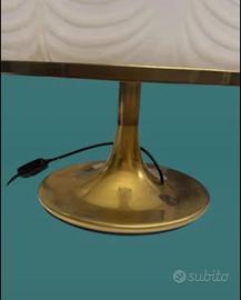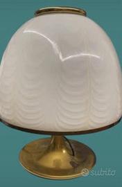 Elegante e scenografica lampada da tavolo vintage di design attribuita a F. Fabbian per Mazzega, realizzata in vetro artistico di Murano con base in ottone. Il grande cappello in vetro presenta il tipico motivo “a piume” bianco con delicate sfumature ambrate, che diffonde una luce calda e molto decorativa. La struttura slanciata in ottone conferisce ulteriore raffinatezza e carattere modernista tipico del design italiano anni ’60/’70. 📏 Dimensioni importanti: • diametro base 30 cm • diametro cappello 45 cm • altezza totale 54 cm Oggetto di forte presenza scenica, ideale per ambienti vintage, modernariato o interior contemporanei. Buone condizioni generali compatibili con l’età.l’ottone presenta alcune macchie di iscurimento , che non ne compromettono la bellezza Ritiro a mano a Milano oppure spedizione accurata da concordare. #lampadadesign #murano #vetromurano #mazzega #fabbian #modernariato #designitaliano #anni70 #vintagedesign #illuminazionedesign #arredamentovintage #lampadavintage #interiordesign #midcentury #spaceage