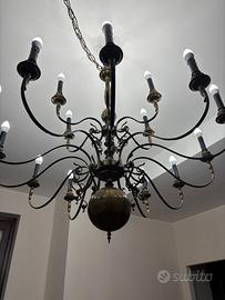 con catena può arrivare a una altezza di 3 mt. struttura metallo bronzo ottone , portacandele neri con luci led a candela basso consumo. Doppio corpo di accensione . Ideale per scala o saloni vintage epoca o modernariato stile liberty.