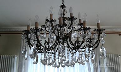 Grande lampadario d'epoca in cristallo molato a mano in stile maria teresa. ben si inserisce in qualunque contesto d'arredo, sia classico, sia moderno (salotto, studio, camera da letto, ingresso, stanza da bagno, ecc.) gocce pendenti tutte presenti; impianto elettrico da rivedere e mettere a norma. 12 luci a perimetro più una centrale. NON SPEDISCO: solo ritiro diretto in zona bergamo (5 minuti dallo stadio). Dispongo anche di altri due lampadari con pendenti in cristallo molato a mano, simili nelle dimensioni, un po' meno antichi ma con impianti elettrici rifatti completamente a nuovo: a richiesta invio foto... Disponibili inoltre alcune coppie di appliques da una a sette luci cadauna...