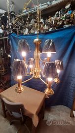 grande lampadario da sala vintage ottone revisionato e Rivisitato con l'aggiunta di paralumi neri interno oro.