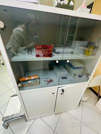 Corredata da due moduli più bassi laterali visibili in foto con ripiani chiusi per immagazzinare oggetti e ripiani aperti da esposizione