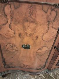 Il mobile è in stile classico Luigi XV / rococò, con linee mosse, piedini sagomati, mensole intagliate e una splendida radica di noce con venature raffinate. La vetrina centrale è decorata con vetri a righe piombati, che danno un tocco di raffinata eleganza.