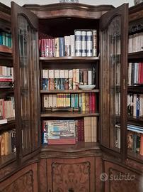 La libreria è composta da due lati con ripiani per libri e una vetrina centrale angolare con ante in vetro e mensole interne. La parte inferiore ha ante con spazio contenitore.