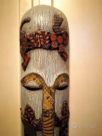 Grande maschera africana intagliata nel legno e con decorazioni batik, in perfette condizioni. Misure 90x20. Solo consegna a mano
