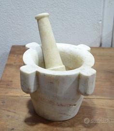 Grande mortaio d'epoca in marmo bianco venato scolpito, con pestello sagomato, anche questo in marmo. Bellissimo oggetto di arredo conservatosi in condizioni perfette.