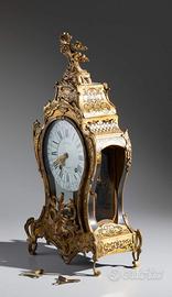 Grande orologio da parete stile Boulle con applicazioni di gusto rocaille in bronzo dorato e lamina metallica su struttura in legno, con mensola d'appoggio.