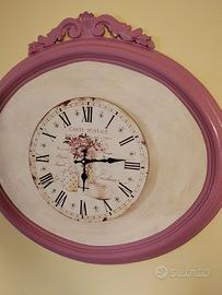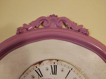 Orologio da parete color rosa antico. La cornice esterna è in legno massiccio smaltato con decoro a motivo floreale. Misure: Larg.75cm Alt.70cm