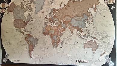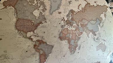 Splendida mappa del mondo murale in stile antico caratterizzata da calde tonalità seppia e dettagli cartografici raffinati. Questa carta geografica di grande formato è perfetta per arredare con eleganza un ufficio professionale, uno studio o una parete del soggiorno. Il planisfero è già predisposto per l'affissione grazie alle eleganti bacchette in legno massiccio posizionate sui lati orizzontali che ne garantiscono la perfetta stabilità e planarità sulla parete. Le dimensioni circa imponenti di 142 centimetri di larghezza e 93 di altezza lo rendono un pezzo d'arredo centrale e di grande fascino. L'oggetto si presenta in ottime condizioni generali con illustrazioni classiche negli angoli che richiamano lo stile delle antiche rotte commerciali. Disponibile per il ritiro a mano visto l'ingombro.