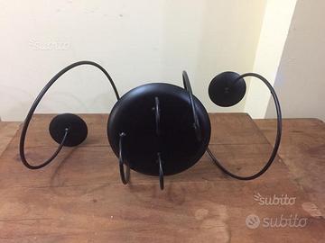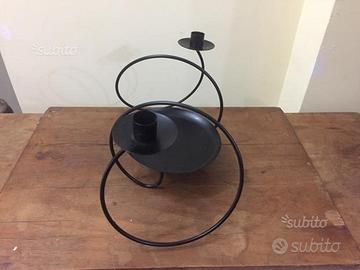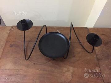 Grande portacandele / centrotavola in ferro smaltato di nero. Si presta per essere decorato e addobbato con fiori, rami e quant'altro possa servire per impreziosire una tavola. Misure: 40 lunghezza x 20 altezza x 20cm spessore; diametro piatto centrale 15 cm. Spedizione o consegna a mano su Palermo zona viale Michelangelo.