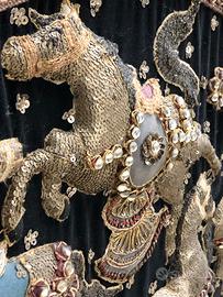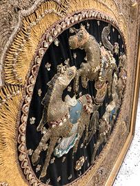 Grande stupendo arazzo stile KALAGA con cornice originale . Misure: altezza cm 110 -larghezza cm 118 Retro originale dipinto colore originale. Birmania.Magnificamente decorato con perle, paillettes, filati in seta e metallo. Ricamo su velluto nero, Rappresentazione di cavalli tridimensionali con lavorazione tessile tipica della Birmania.