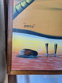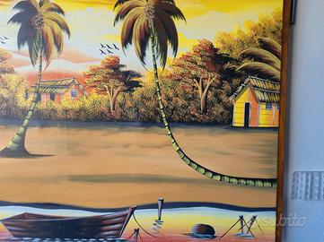 Come da tirolo vendo Grande Quadro Decorativo Tropicale per Arredamenti, disegnato su tela e raffigurante una spiaggia con palme e capanne. Cornice in legno. Ottime condizioni. Misure: 150x100cm. NO SPEDIZIONE, SOLO RITIRO A MANO.