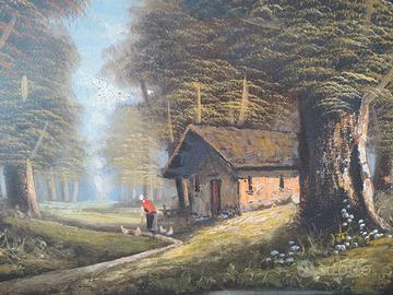 Quadro decorativo di grandi dimensioni dipinto a mano su tela, raffigurante un paesaggio boschivo, con firma visibile (vedi foto). Montato su telaio in legno e completo di cornice dorata lavorata. Misure circa 180 × 100 cm. In buone condizioni, ideale come elemento d’arredo importante per soggiorno o sopra divano o letto. Per via delle dimensioni è disponibile solo con ritiro a mano
