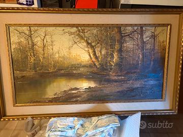 Bellissimo paesaggio fluviale con bosco, luce calda e atmosfera molto suggestiva. Opera di ottima qualità pittorica, non una stampa né una riproduzione, ideale per arredamento di livello (salotto, studio, casa di campagna).