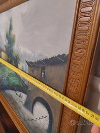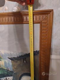 Dipinto vintage di grandi dimensioni raffigurante un suggestivo paesaggio di montagna con lago e architetture rurali con bellissima cornice in legno massello intagliato 72 H x 132 L