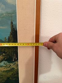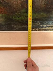 Bellissimo quadro raffigurante un paesaggio lacustre con casolare, natura e montagne sullo sfondo. Toni realistici, atmosfera romantica e dettagli curati. Firmato in basso a destra (artista non identificato). Perfetto per salotto, ingresso o casa in montagna/lago.